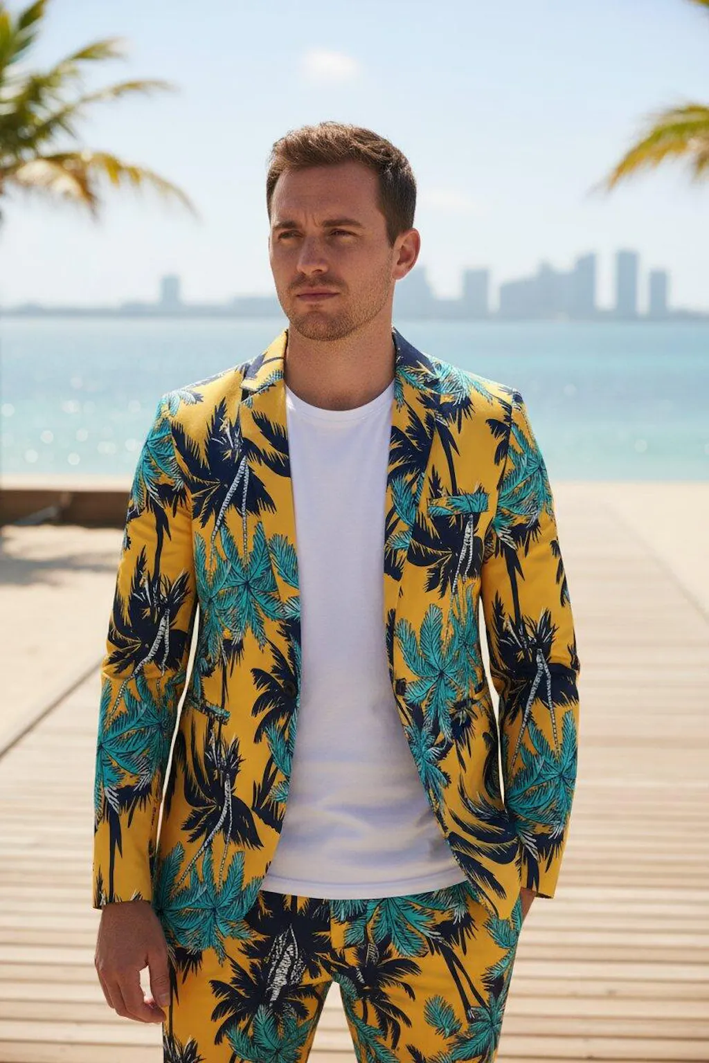Mit einem auffälligen tropischen Palmenprint vereint dieser Anzug entspannte Energie und herausragenden Stil. Egal, ob Sie zu einer Strandparty, einem Sommer-Event oder einem Urlaubsausflug unterwegs sind, er sorgt für müheloses Selbstvertrauen und eine aufsehenerregende Ausstrahlung.